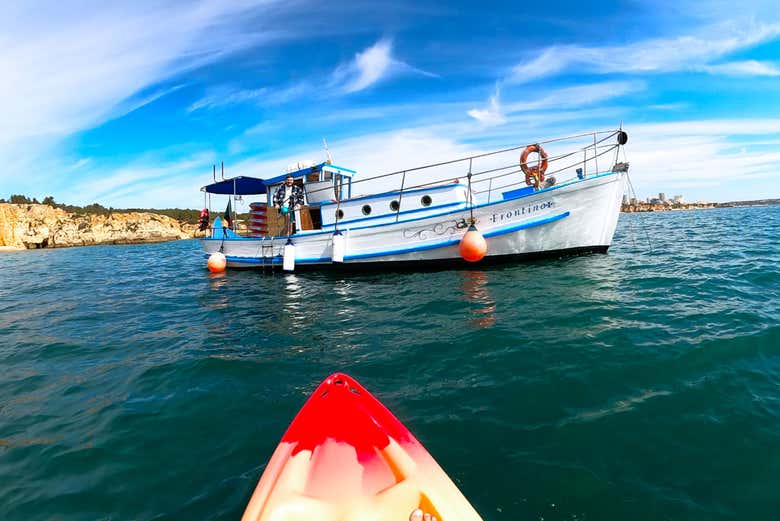 After a cruise along the Algarve coastline of approximately 50 minutes, we'll reach the area of Praia João de Arens and Praia do Va, two of the most beautiful beaches in the south of Portugal. Upon arrival at these beaches, we'll get out of the Frontino to hop into kayaks and explore these beaches.