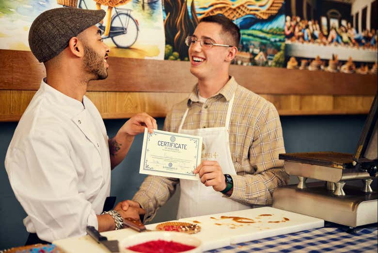 Giving our waffles time to cool, we'll enjoy a well-deserved break with a cup of tea or coffee. Then, we'll at long last get to taste one of our delicious creations. We'll wrap up the other one to take home. To put the cherry on top, we'll get a certificate of our new-found waffle making skills!
