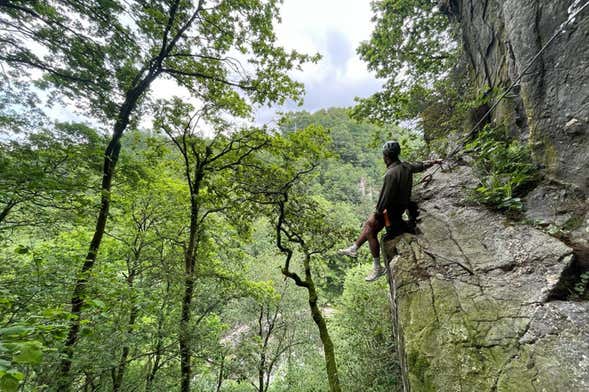 From here, you'll glide down a zipline, spanning the river. You'll feel the rush of flying above the water for 70 meters (230 feet), at a height of 16 meters (52 feet)! Following this, we'll venture into the valley along the 220-meter (721-foot) via Ferrata.