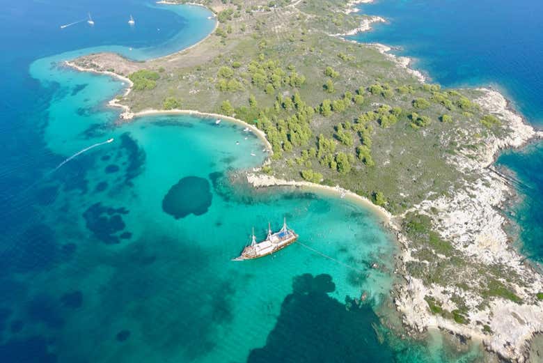 We'll start this boat ride after picking you up from your hotel in Sithonia or Kassandra. Then, we'll head to the port town of Ormos Panagias. Here, we'll board the pirate boat Menia Maria III. It's huge!