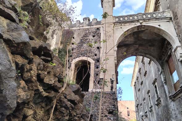 First of all, we'll enter the courtyard of the Benedictine monastery of Catania. This historic site was one of the first to be damaged by the eruption of 1669, which left important remains that can still be seen today, such as huge blocks of lava several metres high.