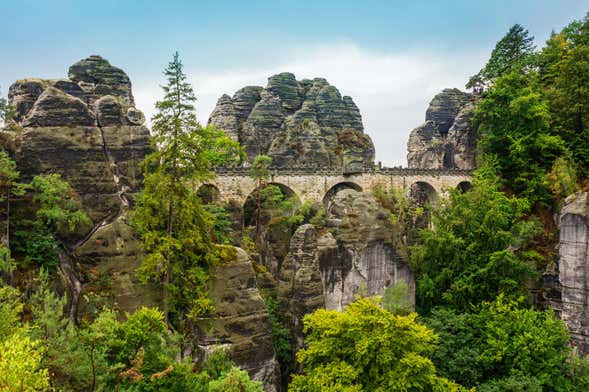 This excursion will take you to Rathen, a municipality located in the Saxon Switzerland National Park. Upon arrival, we'll take a 1 km walk to the Bastei. This viewpoint, known for its impressive sandstone rocks, offers an extraordinary view of the river Elbe. Next to it is a bridge with seven arches, where you can see the Mardertelle gorge and its 40-metre deep ravine.