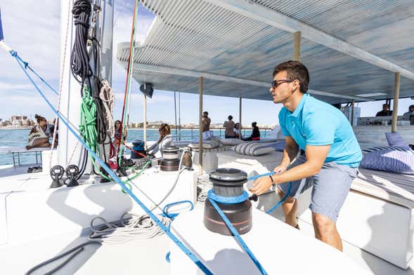 At the scheduled time, we'll meet at the S'Arenal sailing club. We'll welcome you aboard the comfortable catamaran and set off on a boat trip around western Mallorca and Palma Bay.