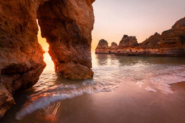 As the sun begins to set, we will leave the port of Lagos and drift along the rugged coastline of Ponta da Piedade, passing through narrow passages such as the Siamesas, Arco do Triunfo and Corredor. As we bob along the waves, you will witness how the sunset makes the rock formations of this area even more spectacular. You will also see some of the region's most famous caves, such as Sala, Catedral, Cozinha and Caveira, lit up by the last low rays of the dying sun.