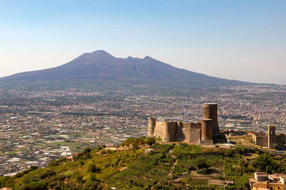 Before entering the fortress, in front of this bastion we'll see the remains of the hermitage of Our Lady of Succour. Its ancient bell tower, decorated with grey tuff and yellow sandstone, contrasts with the Lattari Mountains that can be seen in the distance. It's also a strategic point overlooking the Gulf of Naples, with Mount Vesuvius in the background.