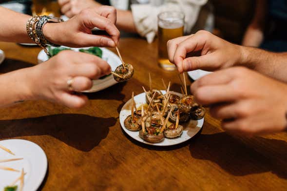 During the tour, we'll visit some of the city's best tapas bars, renowned for serving authentic Spanish food. Among the tapas included, we'll taste the typical stuffed mushrooms or Padrón peppers, ham and Iberian cured meats marinated in wine, braised pork with mashed potatoes, and wine. Please note that these tapas may change depending on availability and the season.
