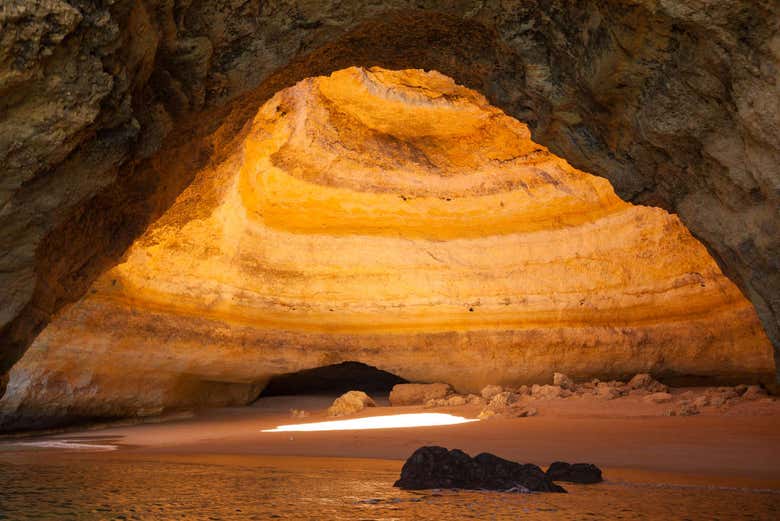 Next, we'll float into the famous Benagil caves, which can only be accessed by boat. We'll marvel at the oculus at the top, which creates a beautiful beam of light illuminating the sandy beach below.