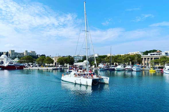 At 10 am, we'll meet at Mandraki harbor. Then, we'll board a brand new catamaran that will take us around the coast of Rhodes. There we'll board a brand new catamaran that will take us along the coast of Rhodes. Are you ready to marvel at the island's scenery?