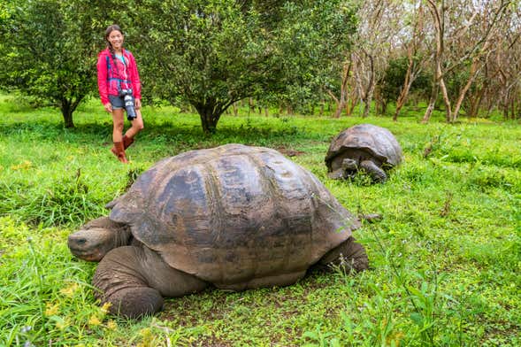We'll arrive at the El Chato Ranch, where giant tortoises roam in their natural habitat. We'll walk along green trails where we'll encounter these peculiar reptiles that can grow up to a meter and a half long and weigh over 250 kilos (551 pounds). We'll see how they eat, roll in the mud and walk through this huge space - you'll be able to take the most impressive pictures of them!
