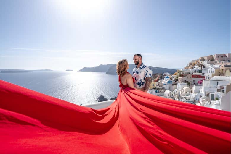 A photographer will be in charge of making you feel like a model while you pose on the streets of Santorini. During the booking process, you can choose between a photo album with your clothes or with a flying dress. This dress is a long dress with a light fabric that creates a very eye-catching effect in pictures due to its flowing effect. You decide!