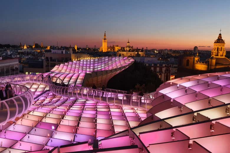 Additionally, if you visit after sunset, you'll get to enjoy Aurora, an immersive lights show. From the observation decks, you'll admire how the Setas de Sevilla lights up with vivid and intense colours. You'll be blown away!