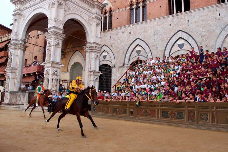 Colorful flags and banners fluttering in the wind, riders trying to lead their swift steeds to the finish line, a contagious, vibrant feeling amongst all the spectators who stoically wait in the stands under the hot Tuscan summer sun... This is the Palio di Siena, Italy's most famous horse race. This competition, dating back to the Middle Ages, takes place twice a year in the historic Piazza del Campo.
