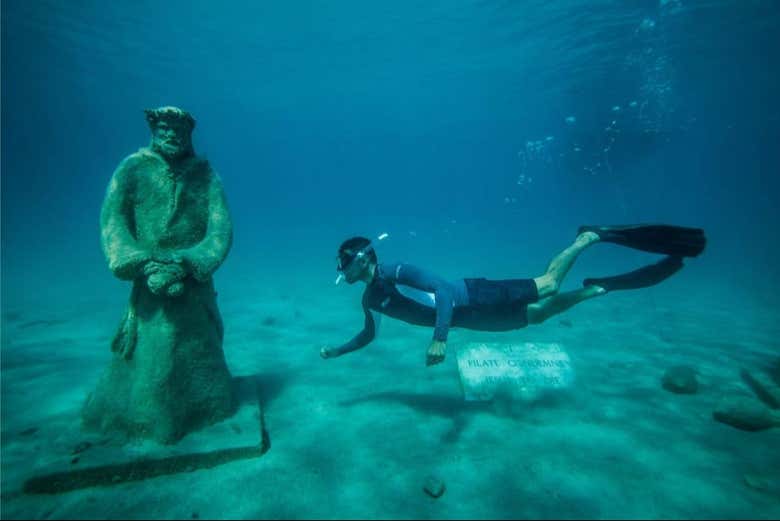 This unique museum, located in an almost secret bay, features more than 50 life-size statues, including an 8-meter (26 ft) high statue of Jesus Christ and a sunken airplane. These sculptures are submerged at depths ranging from 1 to 10 meters (3 to 32 ft), offering a truly unique blend of art and nature. You'll have 2 hours to snorkel and explore this spectacular space.