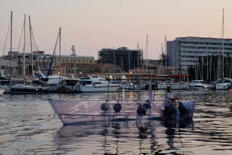 At the indicated time, we'll meet at Via Riva Forte Gallo, where we'll board a modern boat that is completely see-through. From the very first moment, you'll feel the thrill of floating on Syracuse's crystal-clear waters thanks to the glass structure of the boat, where even the seats are transparent. It will be like sailing suspended in the sea!