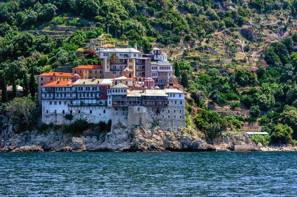 When we reach the border of the Mount Athos region, we'll start to sail along the coast to see the imposing monasteries that stand on the edge of the cliffs. Keep your eyes peeled for the Serbian monastery of Chilandariou, Dochiarioy, Xenophontos, and many others.