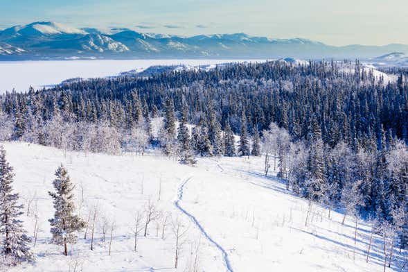 Accompanied by a guide, we'll put our snowshoes on, similar to those used in the past by miners, hunters and fur traders, to trek through the Canadian frozen land. We'll explore tranquil nature and the amazing views across Whitehorse, where we'll also come across many different animal species including foxes, coyotes and Canadian roosters.