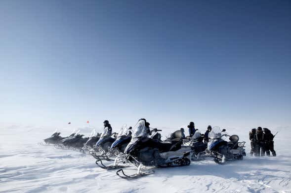Put on your gloves, helmets, and warm clothes and get ready. After a brief training session on how to drive the vehicles correctly and safely, we'll climb on board the snowmobiles and start the route. For the next 40 minutes, we'll go through some of the spectacular icy forests of the Northwest Territories. Following the guide's itinerary, we will also skirt the frozen shores of the enormous Great Slave Lake - the deepest in all North America.